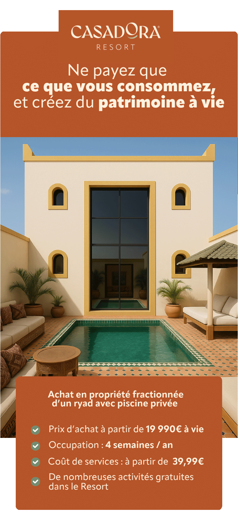 Si vous choisissez de ne pas occuper le Ryad, le modèle Casadora permet de viser un rendement allant jusqu'à 9,7% net par an. C'est un placement hybride idéal : plaisir d'usage et performance patrimoniale.