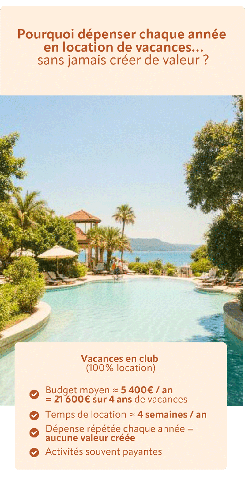 Le time-share est un droit d'usage (souvent rigide et sans valeur patrimoniale). Avec Casadora, vous possédez un actif immobilier réel. Vous investissez dans la pierre, pas dans un simple carnet de tickets vacances.